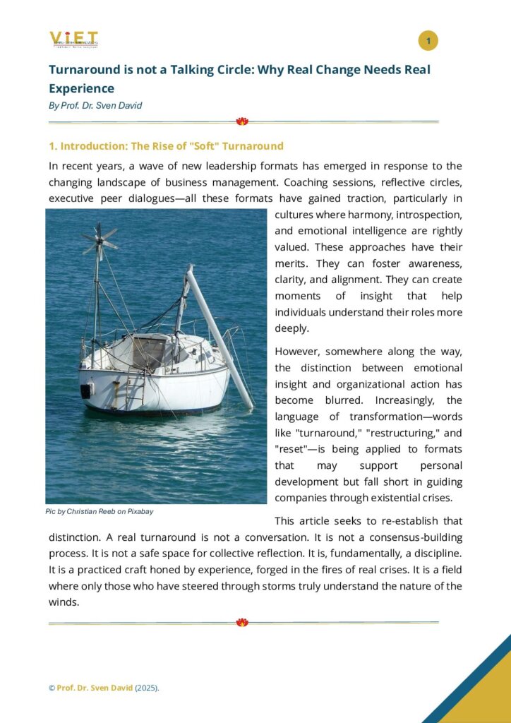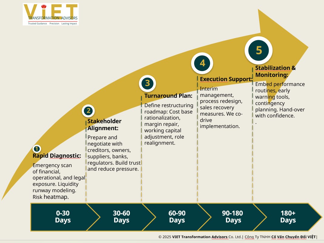VIET Transformation Advisors mobilizes rapidly to help owner-led and mid-sized companies in Vietnam navigate financial and operational crisis. We don’t just advise – we work at your side to stabilize liquidity, re-establish internal control, manage external pressure, and build the foundation for recovery.